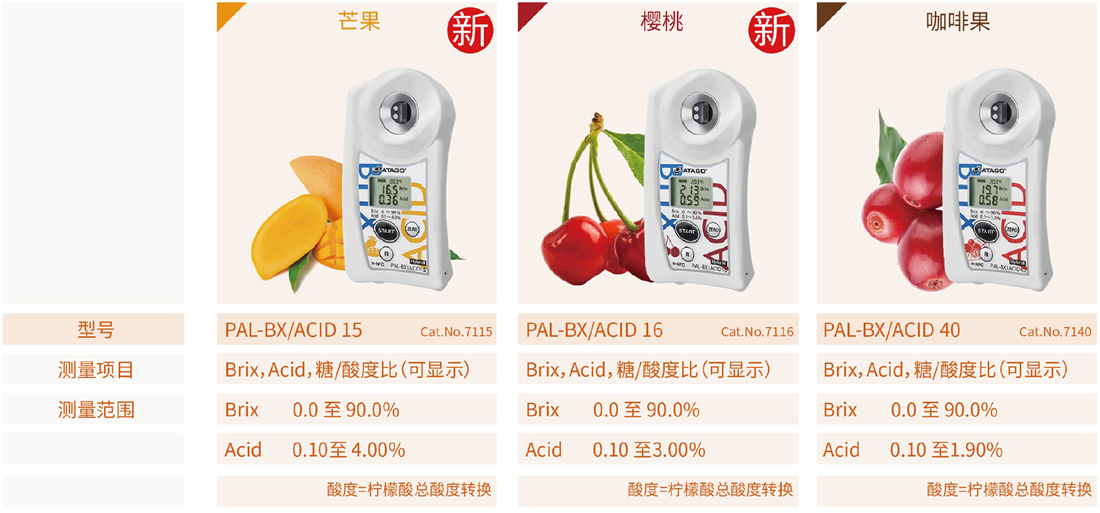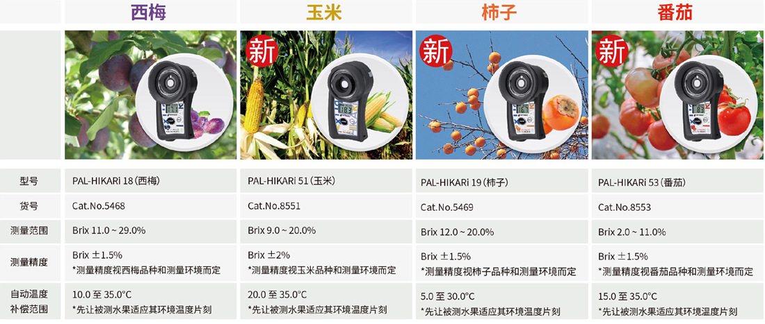 糖度(甜度)是决定水果蔬菜的新鲜度与成熟度的一项重要参数。ATAGO(爱拓)折射计系列,又称水果糖度计,广泛应用于水果种植、果汁制造、水果贸易等行业,通过折射原理测量水果汁液中的可溶性固形物(Brix)含量,仅需几滴果汁,3秒测量水果糖度,快速简便,专业可靠,是测量水果糖度必备仪器之一。