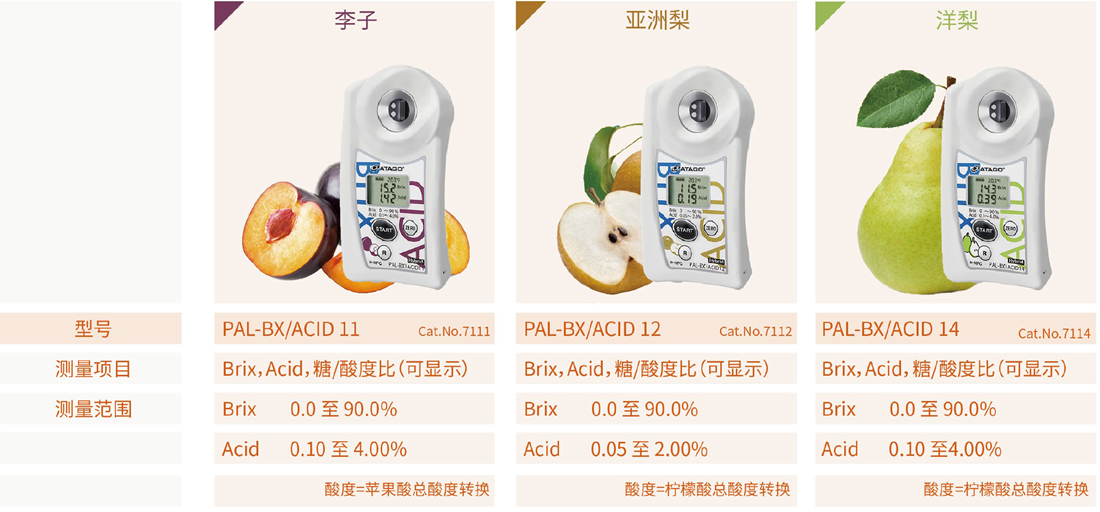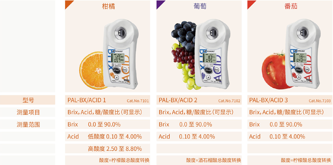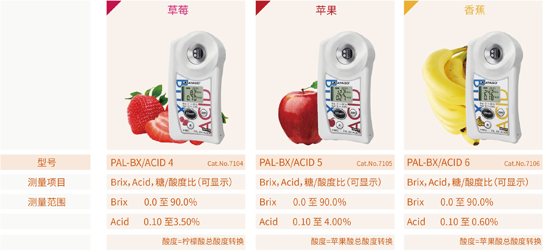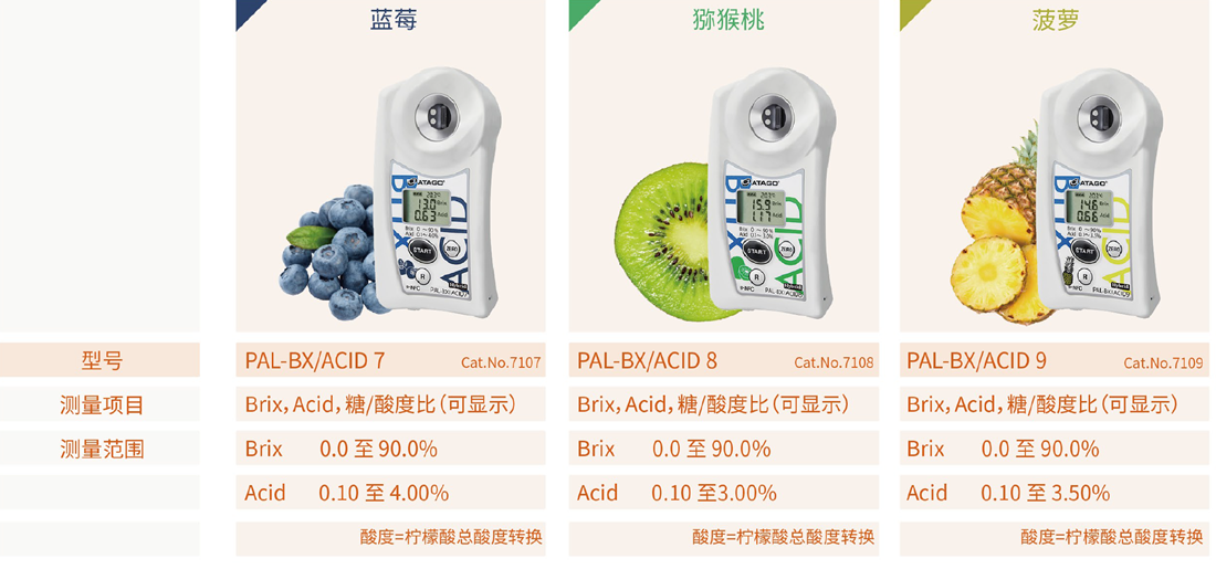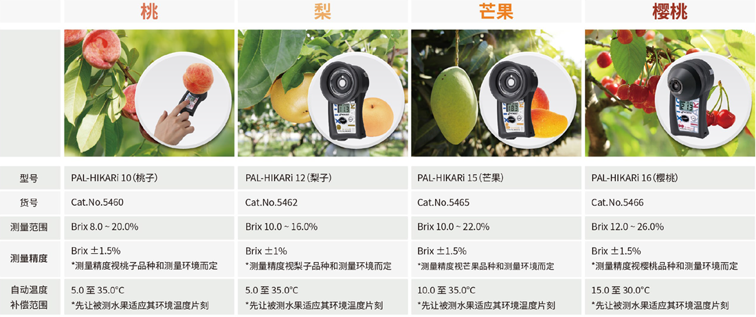 糖度(甜度)是决定水果蔬菜的新鲜度与成熟度的一项重要参数。ATAGO(爱拓)折射计系列,又称水果糖度计,广泛应用于水果种植、果汁制造、水果贸易等行业,通过折射原理测量水果汁液中的可溶性固形物(Brix)含量,仅需几滴果汁,3秒测量水果糖度,快速简便,专业可靠,是测量水果糖度必备仪器之一。